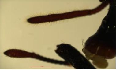 雌雄虫触角呈现明显的二型性,雄虫的远端节为棒状,雌虫的远端节成椭圆的卵状,雄虫触角表面积要比雌虫大两到三倍。